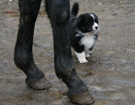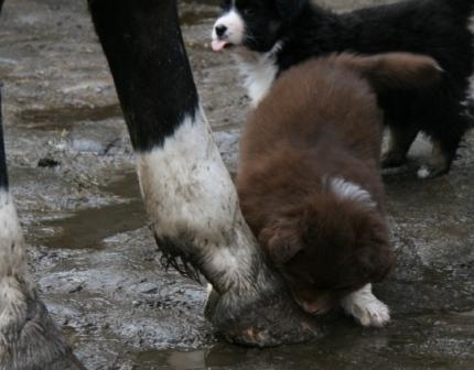 | So nah, duften unsere Welpen noch nie an Pferdehufe... Aber wir hatten auch noch nie so ein nettes Pferd wie Saphira für das Kennenlernen. |