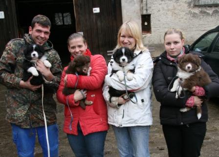 Garten beziehen. Abends und nachts kommen sie zu uns ins Haus, damit sie weiterhin am familiären Leben mit teilnehmen können. Ab der sechsten Woche hole ich mir tagsüber immer mal einen Welpen abwechselnd mit ins Haus. Dort können sie das Rudelleben und die alltäglichen Geräusche im Haushalt erkunden. Im Welpenauslauf befindet sich wöchentlich ein anderer Parcour :o) Die Welpen können auf diese Weise alles nutzen ohne vor lauter Elementen nicht laufen zu können und gewöhnen sich nicht fest an bestimmte Sachen die man dann im Blindflug läuft. Durch die Rettungshundearbeit sind viele Ideen entstanden und somit befindet sich im Welpenauslauf zahlreiches Spielzeug, ein Bällebad, zwei Röhren (eine fest und eine wacklig), eine Wippe, ein Laufsteg bzw. (Umbauvariante) eine Hängebrücke mit einem gitterartigen Aufstieg, ein Schwebebrett, eine Schaukel, ein Kennel, eine Welpenhütte, verschiedene Untergründe, Flatterbänder etc. Mit Beginn der 4. Woche sind die neuen Hundeeltern recht herzlich eingeladen ihren Zwerg zu besuchen. Ab der 6. Woche unternehmen wir regelmäßig Ausflüge in den Reitverein und zu Freunden. Somit lernen die Welpen von klein auf fremde Menschen, Kinder, andere Hunde, Pferde und zahlreiches artfremdes Getier sowie eine abwechslungsreiche Umgebung kennen. Dabei wird jedesmal ein Stück Auto gefahren. Auch unternehmen wir mind. einmal ein kleines Picknick in fremder Umgebung mit dem ganzen Fellowscreek Rudel und den neuen Hundeeltern. Die Welpen sind sicherer im Umgang mit fremden Dingen und Geräuschen und lernen schnell sich auf viele verschiedene Gegebenheiten einzustellen. Zusätzlich bekommen die Zwerge natürlich auch regelmäßig Kinderbesuch. Fotos zur Aufzucht finden sie unter der Galerie. Alle unsere Welpen werden gechipt, nach Titerbestimmung geimpft und natürlich entwurmt, mit Augenuntersuchung, Welpenmappe, Aufzuchtfotos, Abschlussbericht vom Tierarzt, Futterplan und Infomaterial rund um die Biologisch Artgerechte Rohe Fütterung (BARF), Schnuffeltuch von Mutti und Geschwistern sowie ans Autofahren gewöhnt, frühestens im Alter von 8 Wochen abgegeben. Wir ernähren unsere Hunde mit Frischfleisch - BARF (nähere Infos dazu unter Gesundheit). Um auch unseren Welpen den bestmöglichsten Start ins Leben zu geben, werden diese ebenso und vorallem zum Aufbau der ORALEN TOLERANZ mit Frischfleisch, fleischigen Knochen und frischen Vitaminen in ihren ersten Lebenswochen ernährt. Gern beraten wir die Neuen Familien welche weiterhin frisch füttern wollen und freuen uns, dass etwa 80% unserer Nachzuchten weiterhin gebarft werden :o) Nichtsdestotrotz bleibt es allen Welpenfamilien selbst überlassen wie ihr Hund in Zukunft gefüttert wird. Gern stehen wir auch hier beratend zur Seite und können einiges an Tipps zur Auswahl eines optimalen Trockenfutters mitgeben. Sollten Sie Interresse an einem Welpen aus unserer Zucht haben oder Fragen zur Aufzucht, Planung etc. so setzen Sie sich mit uns in Verbindung. Wir freuen uns Sie kennenzulernen! |