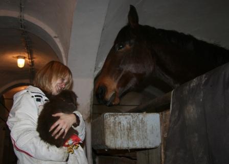 | Unser Ausflug in den Reitverein am Niklaussonntag. Die Stute "Saphira" ist ein sehr nettes und zartes Pferd :o) Wir brauchten um die Welpen keine Angst zu haben. Saphira stand ganz still, schaute nach den Kleinen und bewegte ihre Hufe keinen Millimeter.... (6 Wochen alt) |