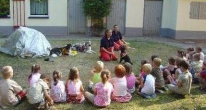 Jährlich sind wir mehrmals mit der Rettungshundestaffel in Kindergärten und Grundschulen unterwegs, um den Kindern den Hund näherzubringen. Auch diese stressigen Tage bei Gruppen bis 15 Kindern pro Hund, machen sie mit einer erststaunlichen Geduld mit. | |