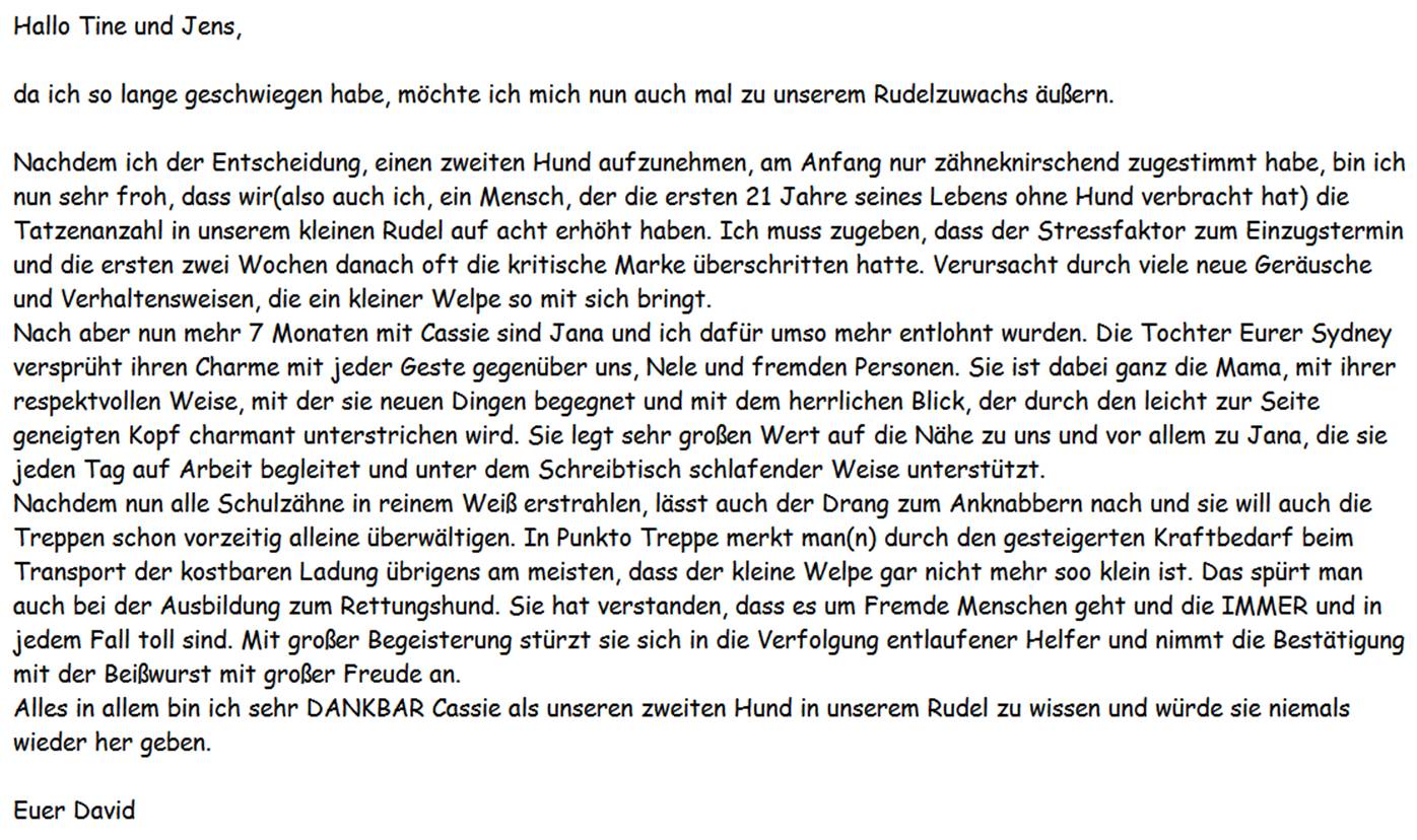 Update Oktober 2014: Im Winter 2013/2014 hatte Cassie ihren ersten Wurf und somit wurde die 3te direkte Fellowscreek-Generation geboren. Die Welpen haben sich alle zu sehr ausgeglichenen und freundlichen Junghunden entwickelt. Cassie vererbte -wie erhofft- zu gleichen Teilen, das tolle Wesen und das raumgreifende Gangwerk, von Mama Sydney und Oma Jamie weiter. Ich bin gespannt was die nächsten Jahre so bringen. Denn nun ist unser Clownfisch auch noch GEPRÜFTER RETTUNGSHUND FLÄCHE. Es ist eine Freude Cassie im Wald laufen zu sehen. Und der Leistungsrichter konnte bei ihrer ersten Prüfung mit 3 Personen in 25.000qm dichtem Wald nach einer großartigen Such- und Konditionsleistung mit 1a Anzeigeverhalten einfach nicht anders ;o) Das gab die Bewertung SEHR GUT in der ersten RH-Prüfung. |