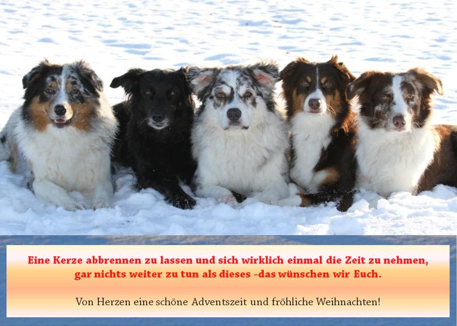 Wir wünschen Euch von ganzem Herzen FROHE WEIHNACHTEN und einen guten Rutsch ins Neue Jahr! Eure Fellowscreek Aussies mit Jens&Tine | |