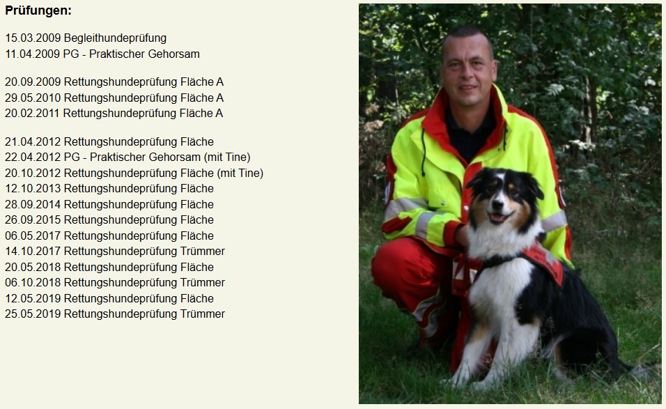 Jens hat mit unserer kleinen Maus Anfang 2009 die Begleithundeprüfung und die PG (eine Gehorsamsprüfung des BRH für Rettungshunde) abgelegt. Im Herbst dann ihre erste Rettungshundeprüfung Fläche und es war eine Wonne sie laufen zu sehen. Auch diese Prüfung hat sie hervorragend gemeistert und der Richter hatte fast nichts zu beanstanden, mal abgesehen von den langen "Denkpausen" vor der Anzeige. Als Prinzessin braucht man ja aber auch etwas Bedacht und den richtigen Platz bevor man jemanden anbellt :o)